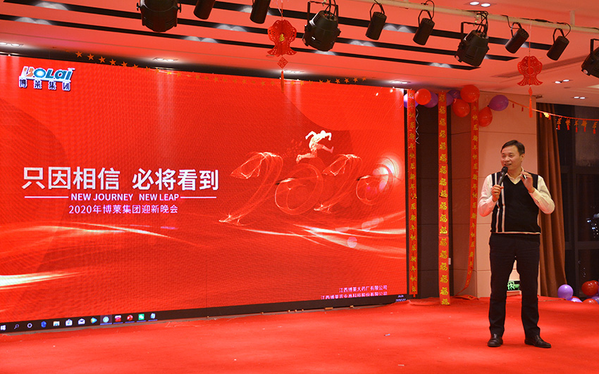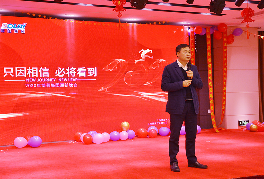 董事长唐进波致辞,他与大家一起总结了2019年在非洲猪瘟的影响下,行业发展的形式,对这一年员工辛勤的努力,给予了高度的肯定,也指出了不足。他还谈到了2020年的发展方向和对博莱家人们的期望,并向全体员工和集团伙伴,致以新年的问候和美好的祝愿。