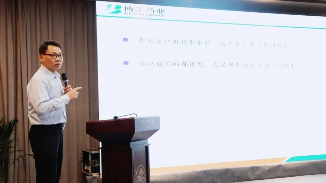 大药厂总经理肖欣戈带领研发和技术团队给大家做了《产品技术开发储备及应用》的培训和现场实验展示。图为研发总监胡国彬给大家做《产品使用&产品开发》培训。